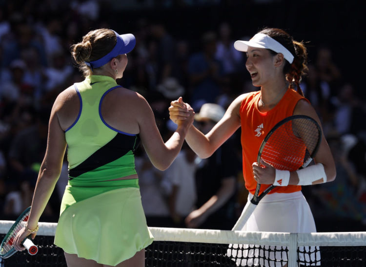 1月26日,王欣瑜(右)与阿尼西莫娃在2026年澳大利亚网球公开赛女单第四轮比赛后持手致意。新华社记者 马平 摄