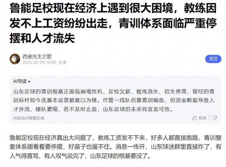 这些音问的可靠性真的有待运筹帷幄,但问题是,到目下截至,俱乐部大略鲁能足校关于干系的爆料,并莫得辟谣,这少许照实耐东谈主寻味。另外,笔据某AI的谜底提醒,从2026年启动,鲁能足校的预算从此前的每年6000万,削减至每年的3500万。若是这一音问属实的话,那么鲁能足校的经济状态真的堪忧。