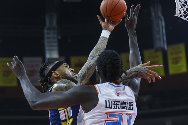 1月4日体育集锦,广东东阳光队球员莫兰德(左)在比赛中与山东高速队球员摩尔争抢。 新华社发(郑家雄摄)