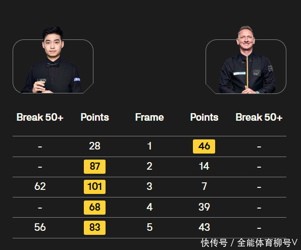 斯佳辉与汤姆-福德的这场比赛,天然莫得打出张安达5-0横扫多特那场轰出三杆破百和一杆50+的火爆进展,但也足以5-3完胜晋级。