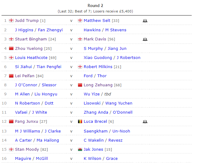 武汉公开赛领域后,除了丁俊晖休战除外,肖国栋、斯佳辉、张安达等联袂中国斯诺克军团继续强势出战。首个比赛日,周跃龙、庞俊旭、雷佩凡、龙泽煌、袁想俊、江俊、吕昊天、国强等8名中国选手联袂出战。
